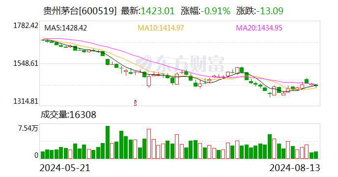 贵州茅台最新收盘价为1423.01元,当天着落0.91%,遭沪股通贯穿净卖出时辰,股价累计着落0.54%,其间上证指数着落0.07%,该股所属的食物饮料行业着落1.55%。