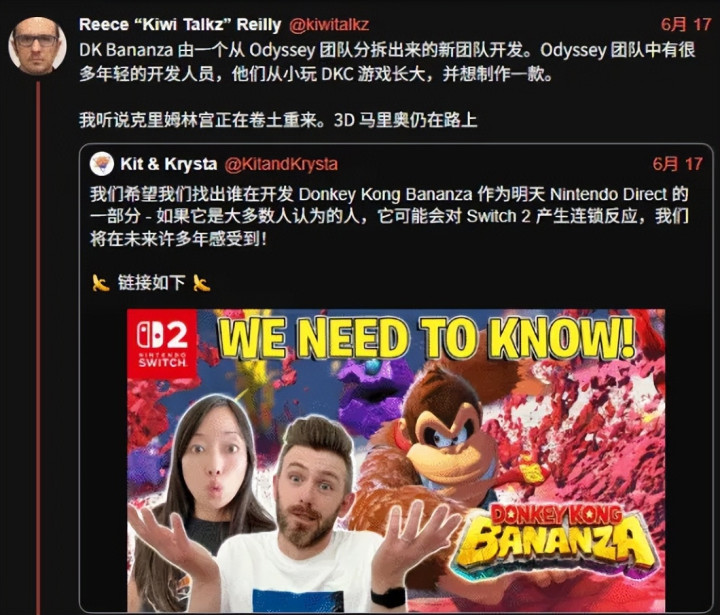 还有谁?还有这个《咚奇刚:蕉力全开》,虽说开辟团队出自《马里奥:奥德赛》,但团队里还是有不少的年青的新东说念主,有据说称本作一定进程上是新东说念主试手作,我复古咚奇刚列入孤苦游戏边界。