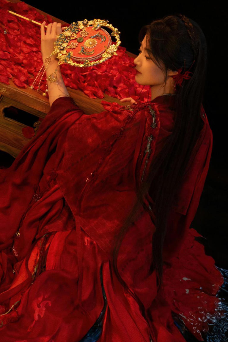 在第四组像片中,卢昱晓倚坐在古椅上,手执折扇,轻纱垂落,红裙与花瓣和会成一幅绝好意思画面。布景口舌的对比与出息红色的点缀,营造出热烈的视觉冲击感。这不仅是一组写照,更像是一场静谧的戏剧,光影之间流淌着故事的韵律。不雅众看着她的含笑,仿佛看见了古代深宅中闺房女子的惊鸿一转。