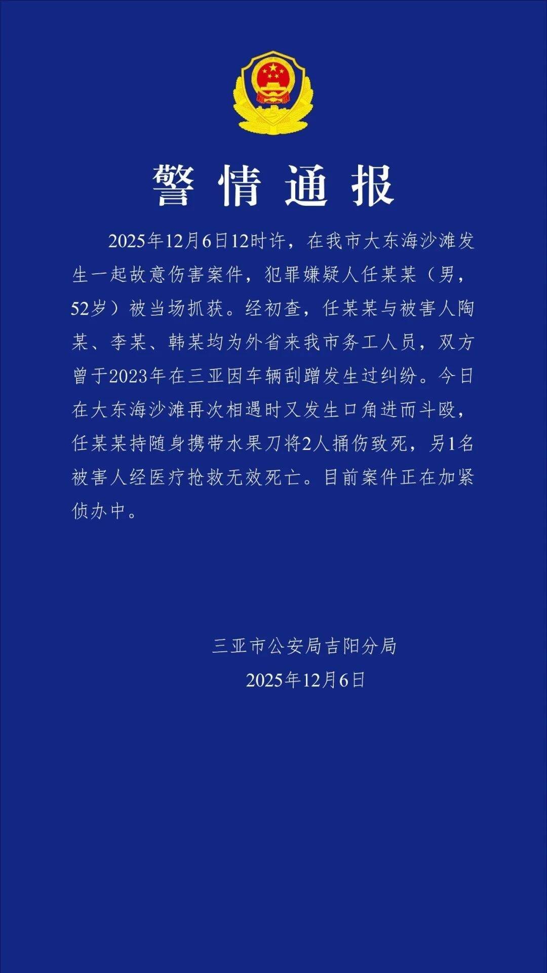 2025年12月6日12时许,在我市大东海沙滩发生一齐特意伤害案件,犯警嫌疑东谈主任某某(男,52岁)被迅速握获。