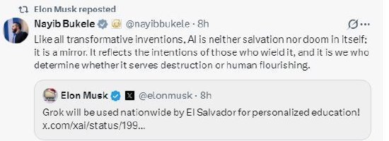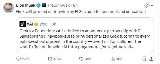 马斯克在X上发帖称:“Grok将在萨尔瓦多世界畛域内用于个性化考验!”