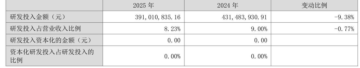 2025年全年,公司研发插足金额为3.91亿元,同比着落9.38%;研发插足占贸易收入比例为8.23%,比拟上年同时着落0.77个百分点。此外,公司全年研发插足成本化率为0。