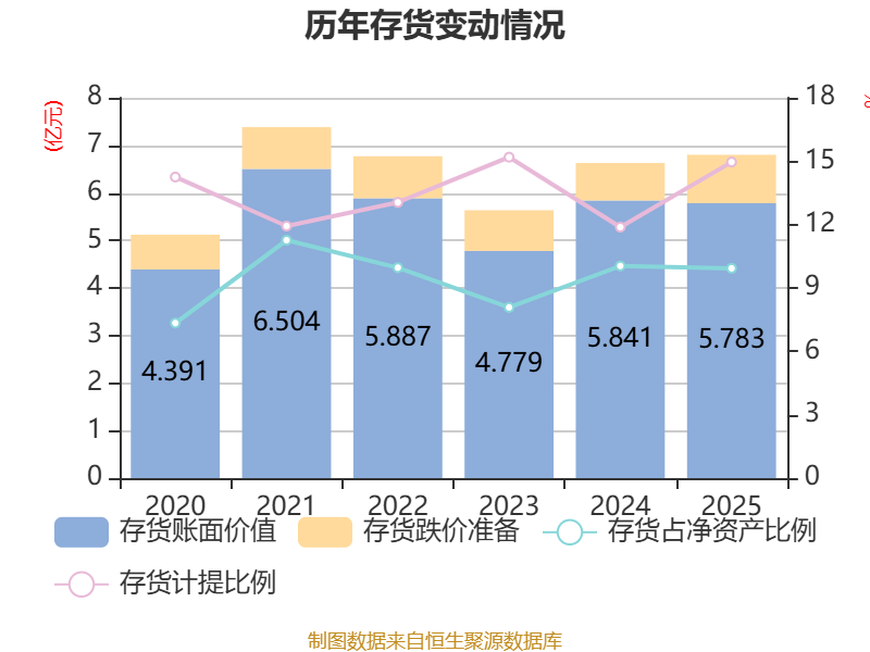 从存货变动来看,欺压2025年末,公司存货账面价值为5.78亿元,占净钞票的9.93%,较上年末减少580.11万元。其中,存货跌价准备为1.02亿元,计提比例为14.96%。