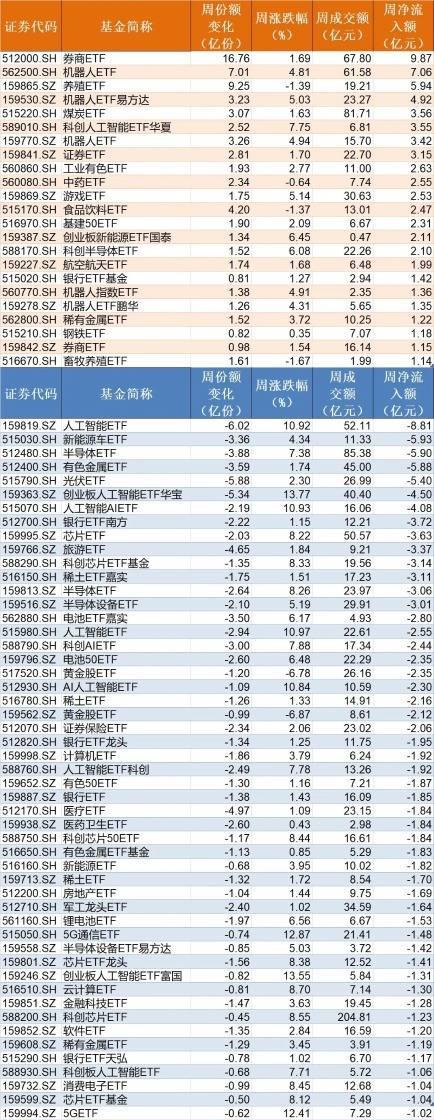 沪深两市股票型ETF和跨境型ETF本周联想净流出逾200亿元。行业主题上看,券商、机器东说念主等ETF被资金看好,而东说念主工智能、新动力车有关ETF被资金抛售。