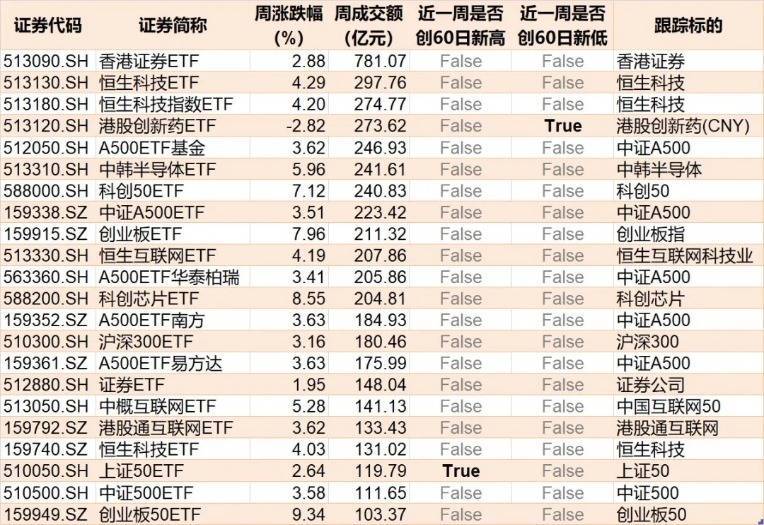 本周,股票型ETF和跨境型ETF成交额超100亿元的ETF有22只。